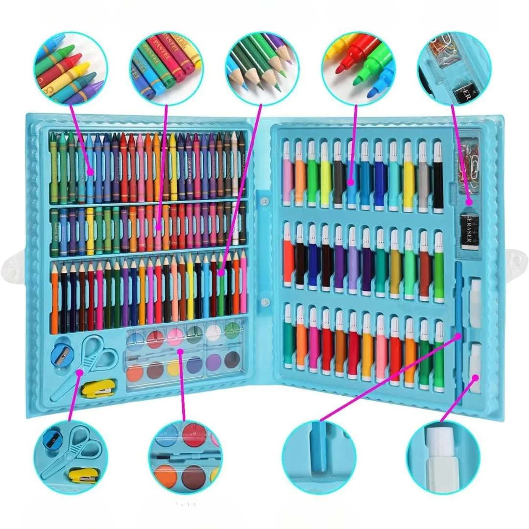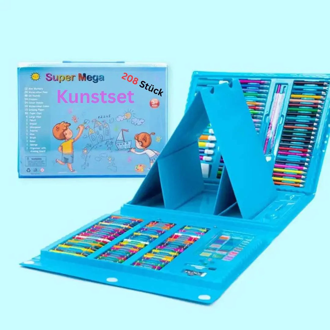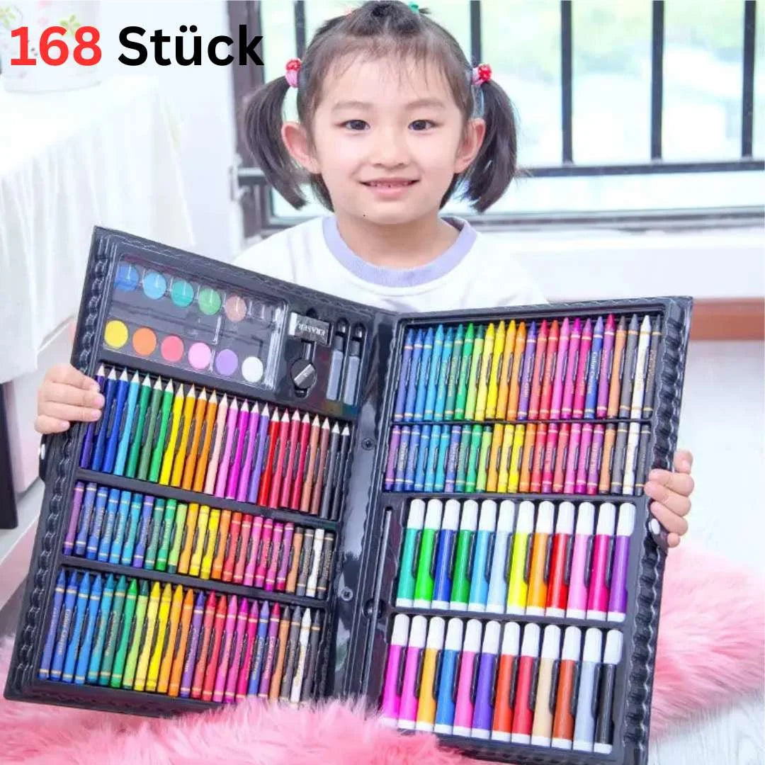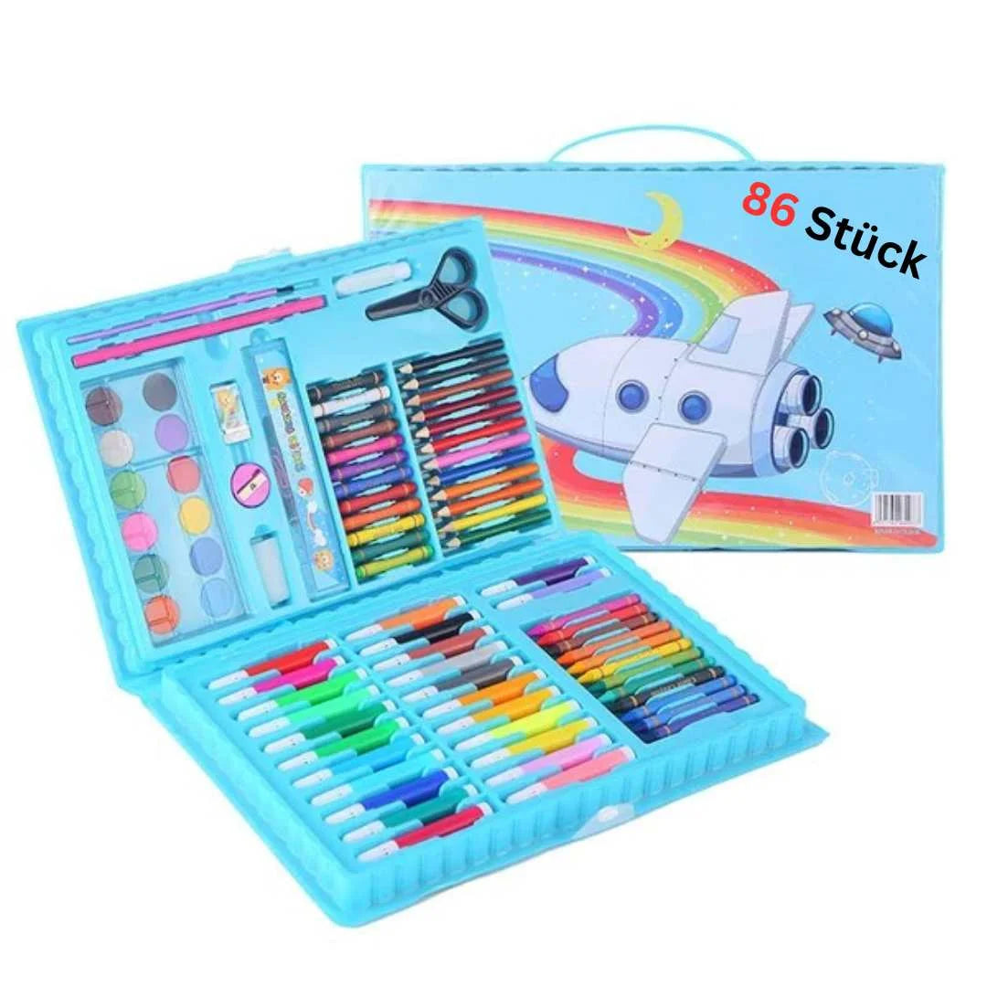 Inhalt: Aquarellstifte, Wachsmalstifte, Wasserpinsel, Maltafel, doppelseitige Staffelei, Malzubehör