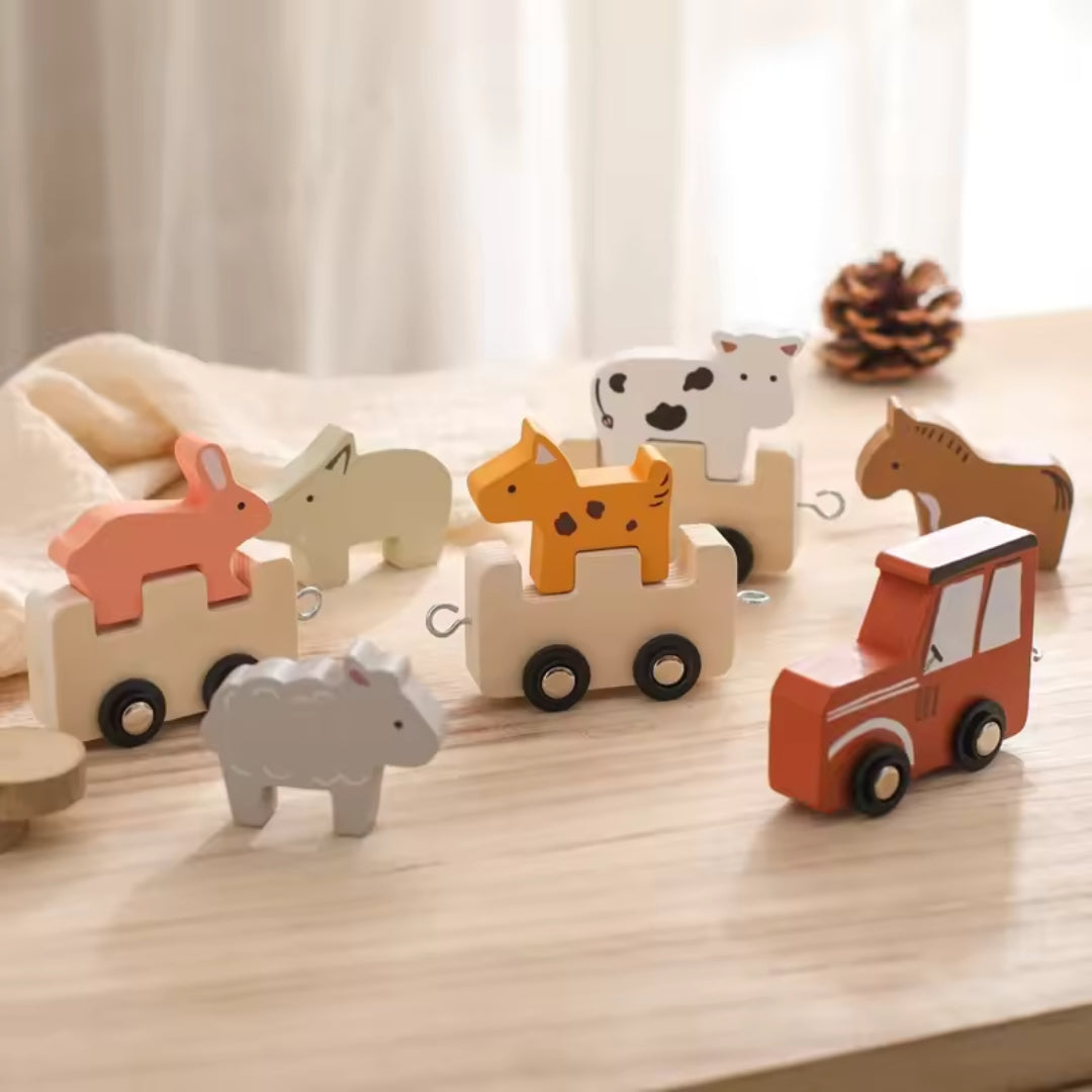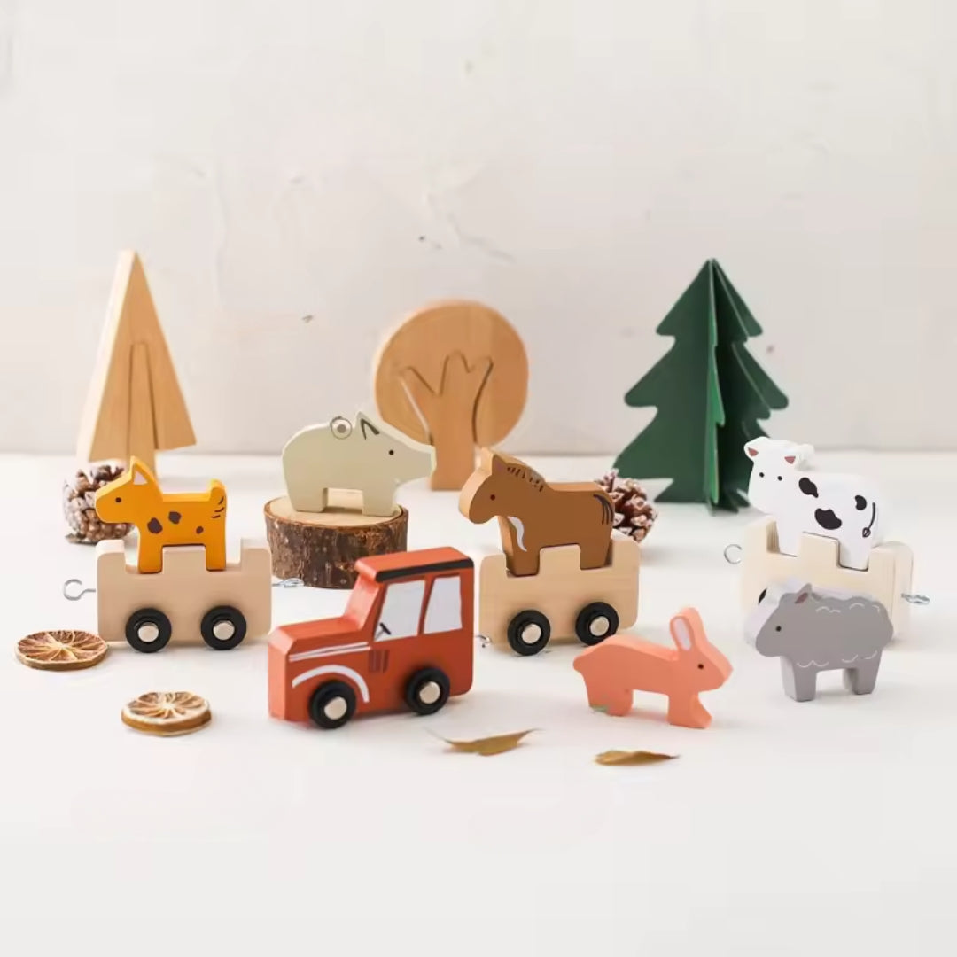 Holz-Zugset mit niedlichen Hoftieren