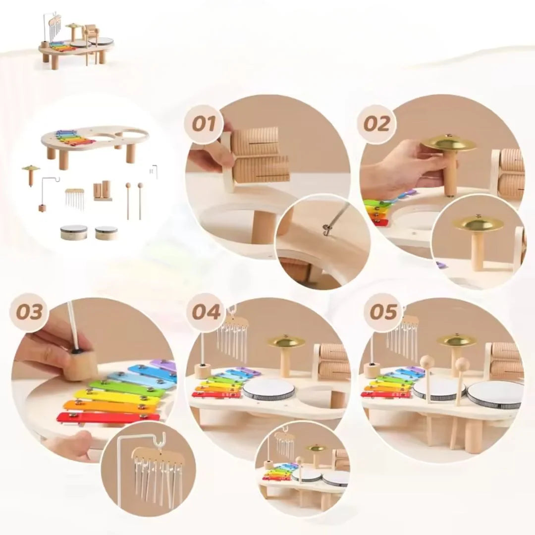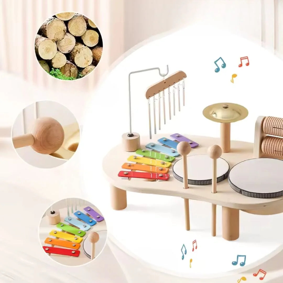 es Musik, Montessori-Prinzipien und sicheres Spiel miteinander verbindet. Das Holz-Schlagzeug regt nicht nur zum Mitmachen an, sondern unterstützt gezielt die frühkindliche Entwicklung – spielerisch und mit Sinn.