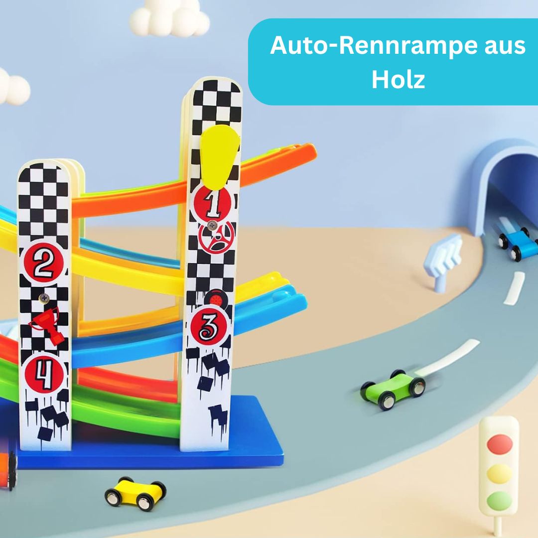 Mit der RennRampe erleben Kinder spannende Abfahrten, actionreichen Spielspaß und gleichzeitig wichtige Lernimpulse! Das farbenfrohe Holzspielzeug bietet nicht nur rasante Rennen, sondern fördert gezielt die motorische und geistige Entwicklung – ideal für neugierige kleine Rennfahrer.