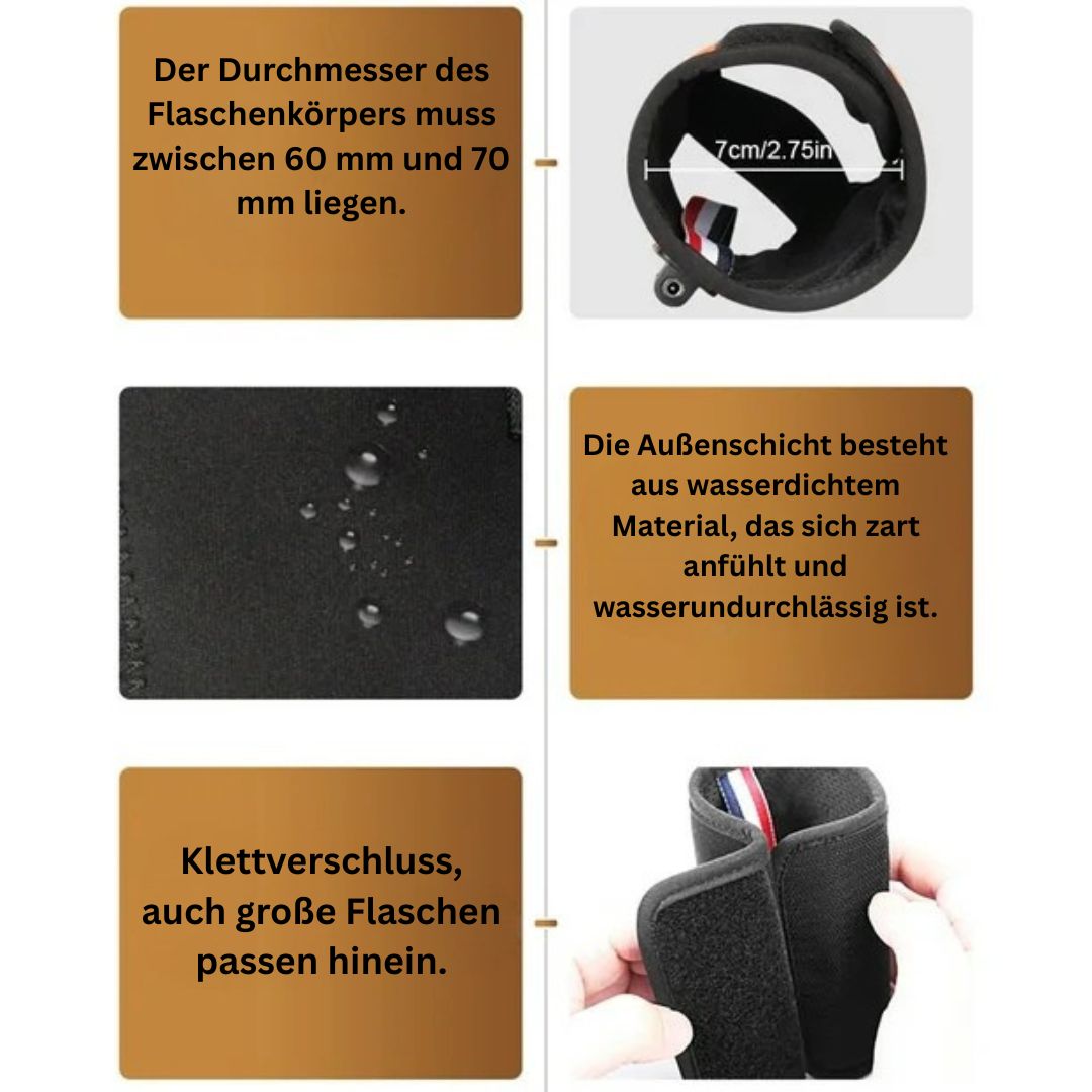 Unsere breite Flasche passt nicht perfekt hinein – sonst wäre es perfekt.