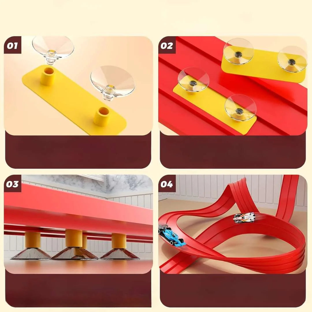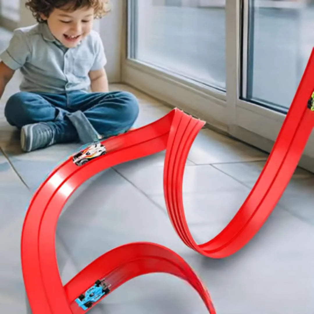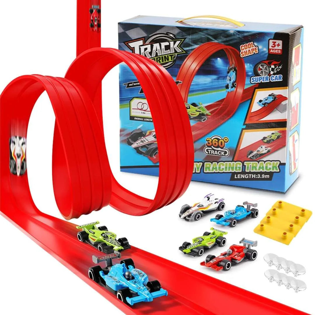- Enthält: 4 flexible Rennstrecke + 4 Spielzeugautos (Die-Cast)